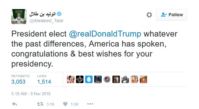 Saudi Prince Alaweed Bin Talal tweeted Donald Trump yesterday.